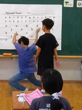 と言った具合に2つずつアルファベットをランダムに読み上げます。黒板に背を向けて立っていた挑戦者2人は、振り向いて瞬時に読まれたアルファベットを探して2つともタッチします。少し前に、1年生がハエたたきを使って早押しのようにやっているのを思い出しました。あれは算数の数字でしたね。
