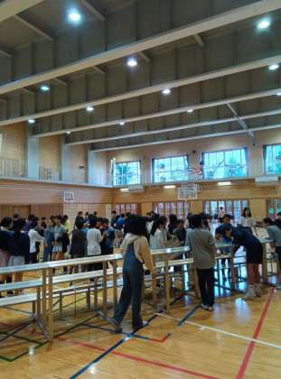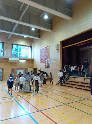 今日は、全校朝会の後、週末の選挙のために一度片付けたひな壇などを出す作業をしました。当初の予定にはない作業でしたが、5年生が朝会後に体育館で作業を手伝ってくれました。説明後、さっと動き出す5年生。あっという間に両脇のひな壇が完成しました。