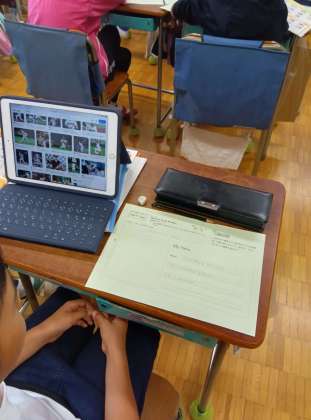 5年生の外国語の授業です。「My Hero」について、表現を考えて書き、発表していました。