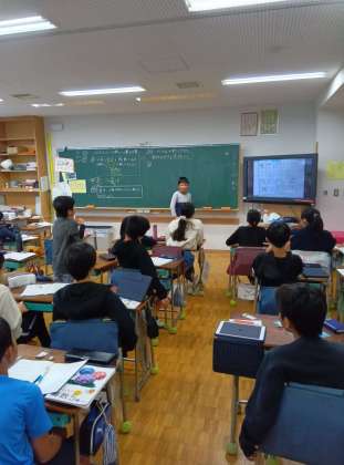 5年生は、分数の学習をしています。この日は「約分」の学習でした。前の時間までに学習した、「分母と分子に同じ数をかけても、割っても分数の大きさは変わらない。」ということを生かして、