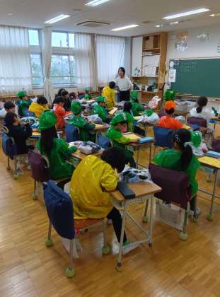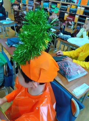 そしてこのクオリティ・・・小学校教員の腕の見せ所です。なんて簡単に言っていますが、本当に大変なんです・・・特に低学年は大人が担う部分も大きく、膨大な作業量に。頭が下がります。1年生のかわいいかぶり物の写真を以前にお見せしましたが、あの量、あのクオリティを出すための作業が夜な夜な延々と続いていました。私も昔、忍者の鞘付きの剣を100本作ったのを思い出しました。