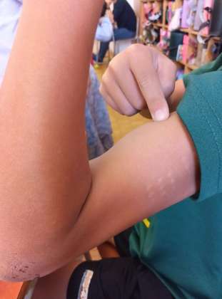 この日は、腕が動く仕組みについて学習していました。腕の筋肉と骨が組み合わさった模型があり、曲げると腕の上の筋肉がぐっと膨らむのが分かります。逆に下の筋肉は縮んでいます。もちろん、自分の腕でも確かめることができますのでやってみます。確かに。