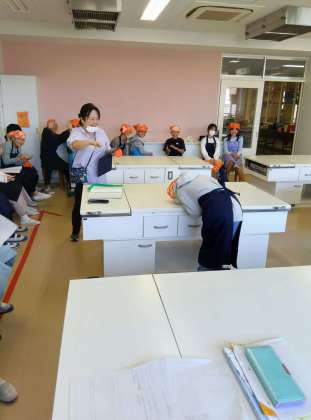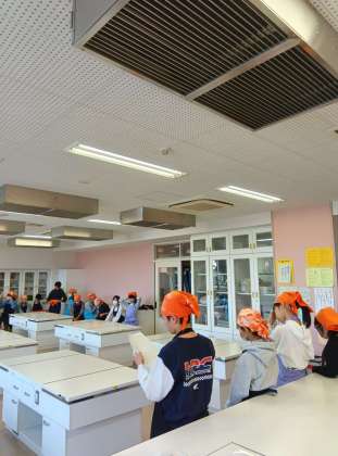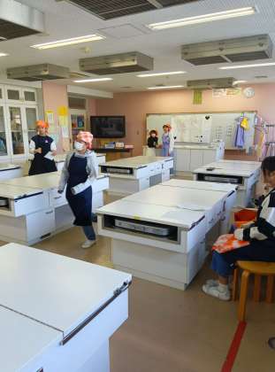 家庭科室の回りに子どもたちが座り、前でそれぞれのエプロンの工夫を発表しました。発表が終わったら、ランウェイスタート!