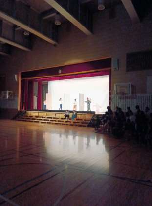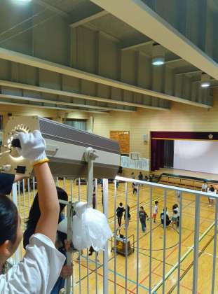 劇の練習に合わせて、照明の練習もしていました。照明のスポットライトなどは、強い電球を使っていて熱くなるので、作業は必ず軍手をはめて行います。子どもたちは、自分の舞台での出番を終えて上に行ったり、前半照明を担当してから下に行ったりと行き来しながら作業にあたっていました。