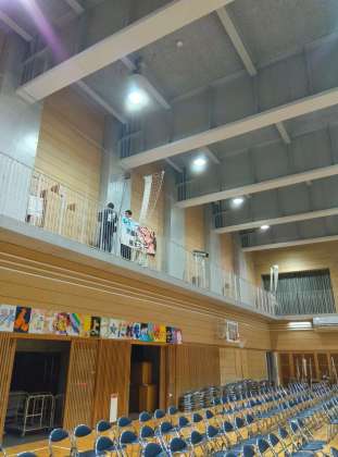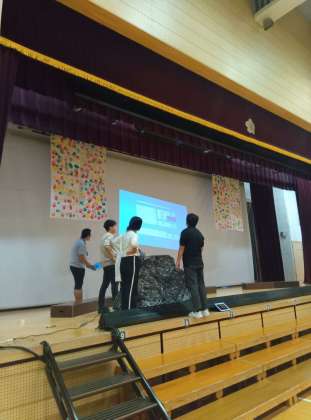 ほぼ完成した会場で、各学年が大道具の位置や移動などを確認しています。また、放送、照明、大道具など、各自の担当の仕事もチェックです。こちらもいよいよ大詰めです。