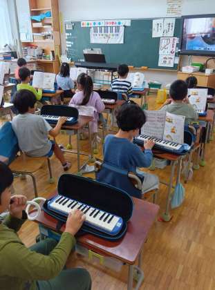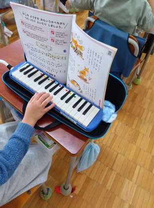 2年生の演奏に話を戻しましょう。鍵盤ハーモニカでの演奏です。ドレミファソ♪ソ♪という入りの階段のメロディ、鍵盤が苦手な子にも優しいです。その後は少し音が飛びますが、覚えやすい印象的な音の運びで弾いている様子を見ていても楽しそうです。そして鍵盤ハーモニカのしっかりとした音が合う曲だなあと改めて思いました。