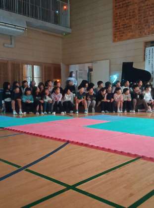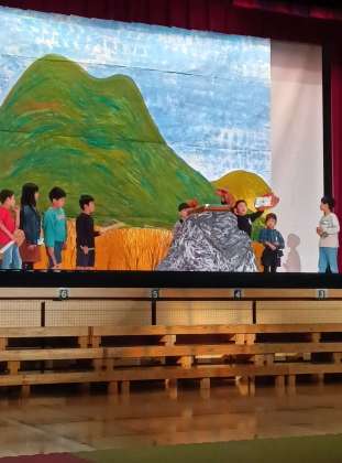 『たからじま』という島には、○○がない・・・・?!そんな島に歌や踊りが大好きで陽気な海賊たちが、宝を探しにやって来ました。島の動物たちに出会い、ズッコケながらも、ついに見つけた宝とは?!初めての学芸会に緊張しながらも一生懸命練習してきました。2年生みんなで元気いっぱい演技ます。乞うご期待!