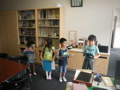1年生が学校探検で校長室にきました。保健室、理科室様々なところをまわっているようです。