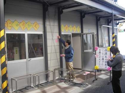教室では、机の上に1年生に渡す教科書などなどを置いていきます。昇降口では、飾る花を輪になって作っています。先生方も掲示等で笑顔で準備を進めています。
