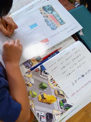 文章の第一段落に2つの問いが並んでいました。ということで、子どもたちはいくつか出てくる車について、それぞれの車の「仕事」と「つくり」を読み取っていました。消防車や救急車、大きなトラックなど写真が載った「はたらく車」の本が小さな時に好きだった子は多いと思いますが、車好きにはたまらない単元です。