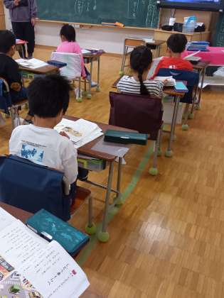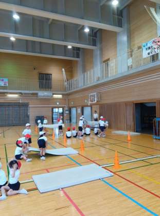 さて、体育館ではマットを使った運動遊びに入るようです。この日は、道具の準備の仕方について確認していました。マットを運ぶのにも決まったやり方があります。人数やルール、教わったやり方を守って行うことでけがや事故を防ぐこと、そして素早い準備・片付けにつながります。1年生でしっかり身に付けてほしいと思います。