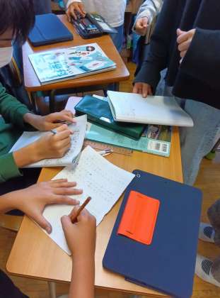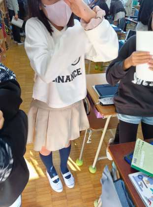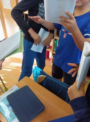 この日は、調べたことをお互いに伝え合っているところでした。左の写真は「なんでだろう〜♪」みたいに見えますが、説明の中で出てきた「断層」という言葉について更に質問を受け、それについて体で必死に表現しようとしているところです。