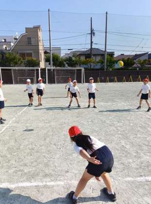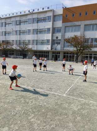 小さな正方形の四角のコートを作って中当てをしています。まだそれほど投げる力が強くない1年生ですが、一生懸命コントロールして相手をめがけて投げています。