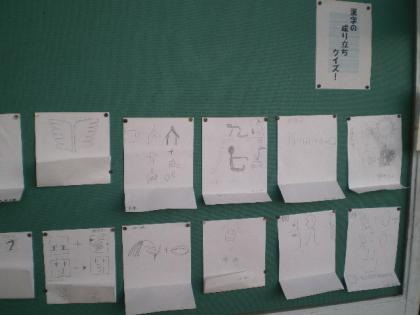 学習の中で、漢字の成り立ちクイズを作り、廊下に掲示しています。一人でも多くの人に興味をもってもらえればうれしいです。