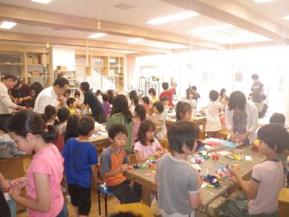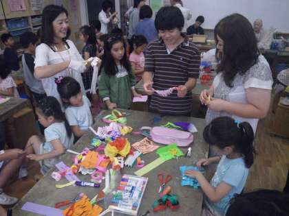 7月の「このゆびとまれ」は七夕の飾り作りです。図工室にはたくさんの子どもたちが参加しています。ほごしゃの方々も多数お手伝いに来てくださっています。もちろん先生方もたくさん参加しています。高橋恵子さん、高橋佳一さん、第六天会の鈴木会長を中心にみんなで作り上げています。