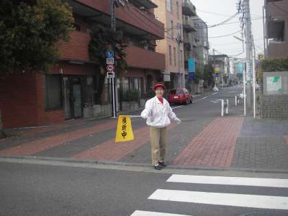 信号が赤の時は、旗をびしっと横に出し、待つようにしてくれます。9時までは通行禁止の道路がありますが、進入してくる車には毅然と止めて、注意をしてくれています。