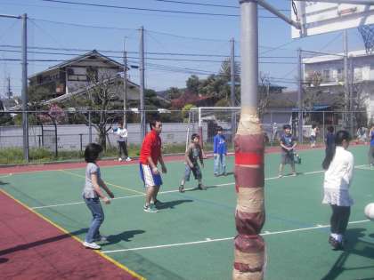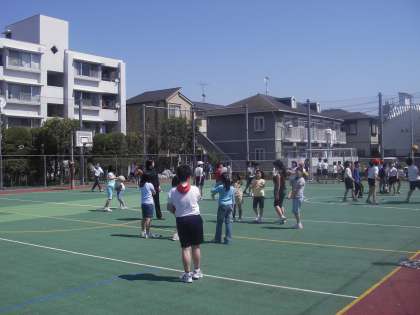 10日は初夏のような天候です。20分休みの第二校庭は子どもたちがボールなどを追いかける声であふれています。先生も子どもたちと一緒に遊んでいます。