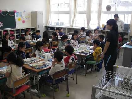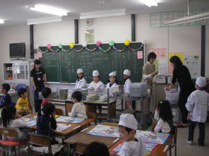 1年生は、13日からの給食を前に、今日10日に給食の配膳等の練習をしました。突然、直前のお手伝いのお知らせにもかかわらず、保護者の方がお手伝いに来てくださいました。有り難うございました。