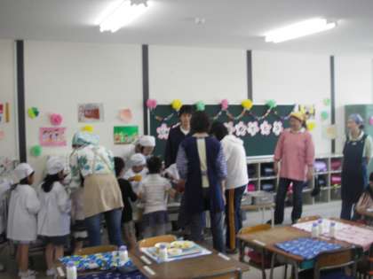13日、今日から1年生も本格的な給食です。保護者、PTAの役員の方々がてつだってくださっています。おかげさまで大きな混乱もなくスタートしています。