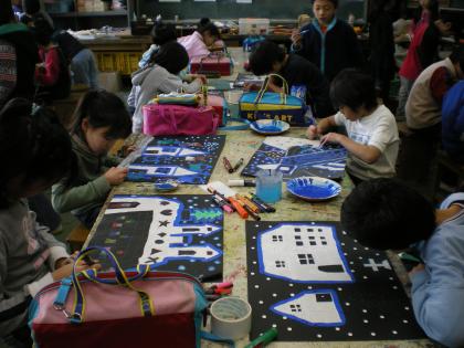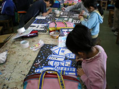 今、図工ではテープ、絵の具などを用いて、児童が考える「氷の世界」を描いています。家や広場、そして学校まで氷で出来ています。カラフルに描かれていて、とても暖かい感じがする作品ばかりです。
