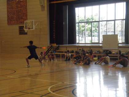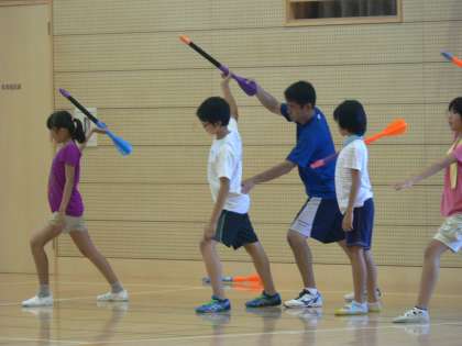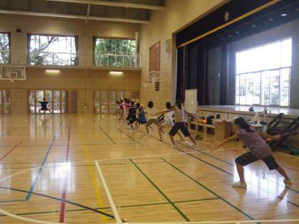体育館では実技です。昨年度、この講座を見たときに、走る指導のやり方、投げる指導のやり方を見て、衝撃を受けました。本当にプロの指導者なのです。事実昨年度は走る速さも変化しました。投げる距離ははっきり明確に指導の成果が表れていました。是非、授業にきていただきたいと思いました。今年はこの講座は二回あります。8月27日にも2回目があるのです。ありがたいことです。写真は投げる練習の様子です。フォームが悪いと肩を壊したりするというお話でした。(校長 箭内)
