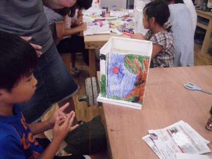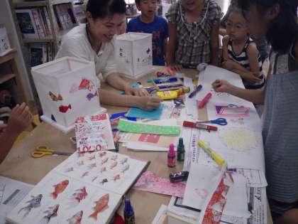 八月の「このゆびとまれ」は恒例の「灯籠作り」です。木枠は高橋佳一さんが作ってくれました。子どもたちは絵を描き、木枠に貼り付けます。瞬く間に灯籠の出来上がりです。明日は、いらか道で用賀町会主催の「納涼の夕べ」があります。今日作った灯籠を持ってきてください。素敵なプレゼントがもらえます。