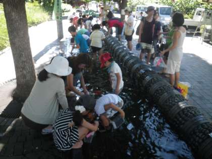 21日(火)は用賀町会主催の「納涼の夕べ」です。3時からはまず、恒例の「ドジョウつかみ」です。いらか道の水路は子どもたちでにぎわっています。ドジョウをつかまえているのです。つかまえたドジョウを見せてもらいました。美味しそうなドジョウです。昔は、夏になるとウナギとドジョウは良く食べました。ご馳走でした。しかし、今はドジョウは飼うようです。(校長 箭内)