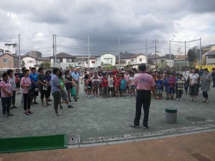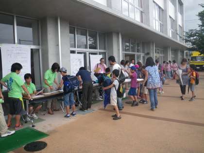 9月1日は「避難所運営訓練」です。校舎、校庭の工事も終わり、新しい校舎での初めての訓練です。避難所の運営は用賀町会が担当となっています。しかし、実際には、学校はもちろんPTA、保護者、パパサポ、地域の方々が協力しあって運営していくことになります。全体会の後はグループごとに体験していきます。大事なのは受付できちんと名前を書くことです。避難者の名前、人数等をきちんと把握しなくてはなりません。
