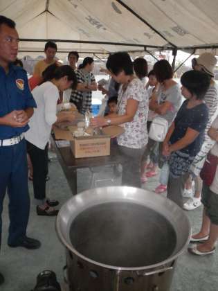 避難所では食事の用意もします。バーナーを使い、大釜でお湯を沸かします。アルファー米でひと箱で50食分あります。