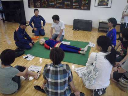 AED、人工呼吸も必要な練習です。みな真剣に話に耳を傾けています。(校長 箭内)