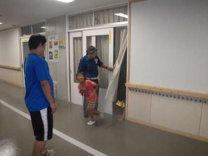 煙体験は、最初は校庭に大きなテントを張り用意をしましたが、雨が降ってきてしまいました。急遽教室で行うことにしました。実際に煙の中を歩くと前が見えないことが分かります。恐怖心が起こってきます。