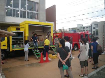 起震車は最初雨のためできませんでした。しかし、雨があがり体験できることになりました。震度七の揺れは想像以上に厳しい揺れでした。しがみついているのが精いっぱいでした。(校長 箭内)