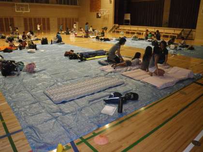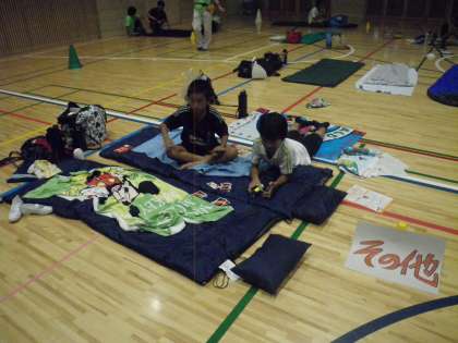 宿泊は体育館です。おもいおもいに寝るための用意をしてきています。体育館は広いです。お泊まりは60人強ですが、すかすかです。9時消灯です。お休みなさい。(校長 箭内)