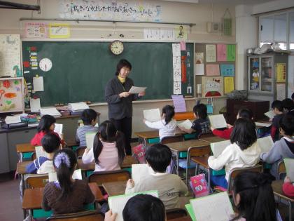 授業の導入は朗読「たべもの」です。「もこもこ さといも ほこほこ さつまいも・・」先生と子どもたちが、掛け合いながら朗読しています。先生と子どもたちが終わったら、今度は子ども同士で掛け合いながら朗読です。元気な声がとても気持ちがいいです。