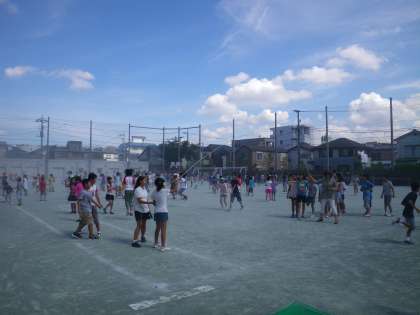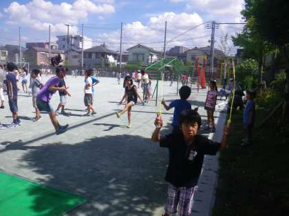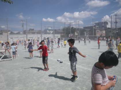 校庭で1年生から5年生(6年生は体育館)まで校庭で縄飛びをやったら砂埃がもうもうと立ってしまいました。縄飛びの前にたっぷり水をまかなくてはいけません。