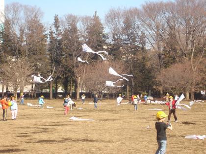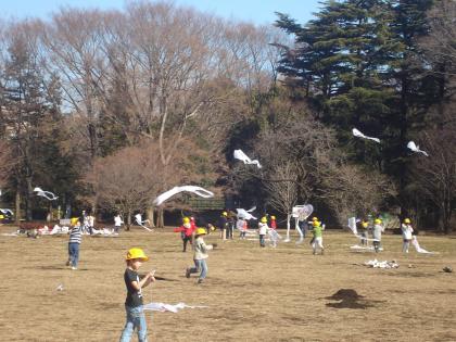 2年生に教えてもらって作ったたこを、砧公園で揚げました。風向きを考え、走ったり糸をのばしたり。手作りのたこがうまく揚がってみんなうれしそうでした。