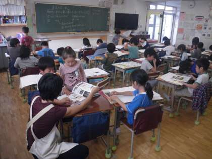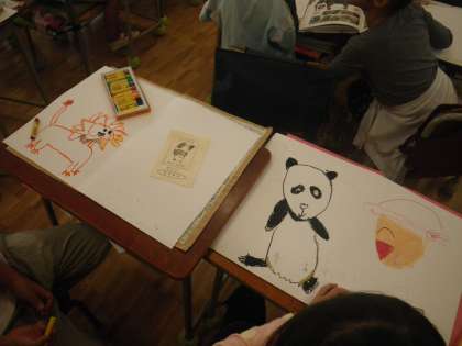 2年3組は増田学級ですが、図工でした。志賀先生が指導していました。遠足の思い出を絵に描こうです。上野動物園に行って見てきた動物を描きます。勝手に遊ぶ子もなく皆、絵を描くのに集中しています。(校長 箭内)