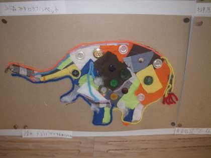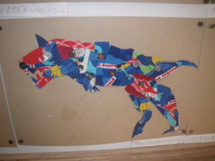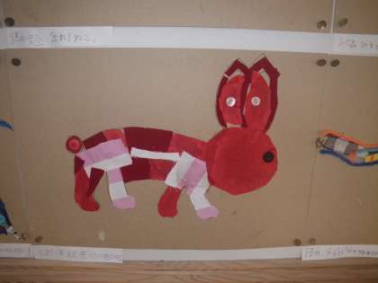 校舎内を歩いていたら不思議な動物と出会いました。壁一面に張られています。うーむ、これは何者なのか。色とりどりの衣装をつけている。一匹一匹を見ているとしだいに引き込まれていくのです。なかなかの出来栄えだと思うのですが。いかがでしょうか。(校長 箭内)