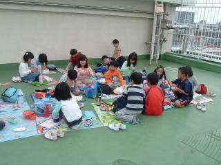 5月9日。またまた雨が降り、遠足が延期になってしまいました。でもこの日は、後から雨があがったので、屋上でお弁当を食べて、グループでなかよく遊びました。