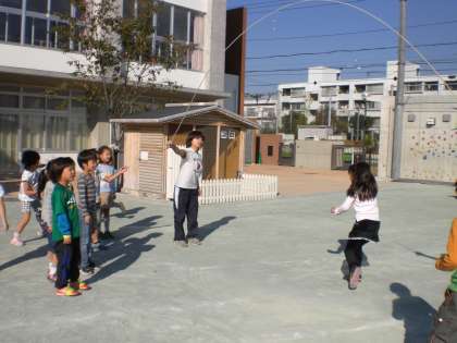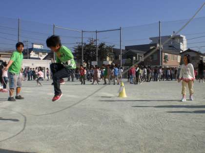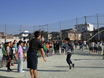 木曜日の朝、雨がぽつぽつ降っていたために、体育朝会が金曜日に延期となりました。金曜日は天候にも恵まれて、朝から全校で気持ち良く運動をしました。今回はクラスごとに大縄跳びをやりました。1,2年のまわし手の助っ人として主事さんたちにも協力をしていただきました。八の字跳びに挑戦しましたが、1年生や2年生もなかなか上手に跳んでいました。休み時間にもみんなで跳べるといいですね。(副校長 藤咲)