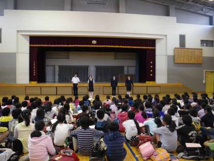 今日は6年生が用賀中学校に体験入学です。体育館で中学校の制服から授業、生徒会、部活などの説明を用賀中学校の生徒から聞きました。