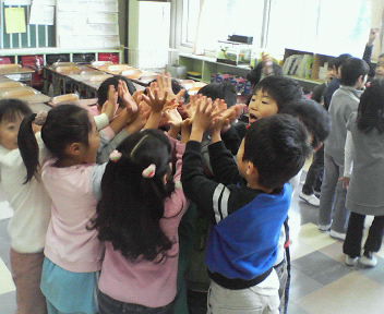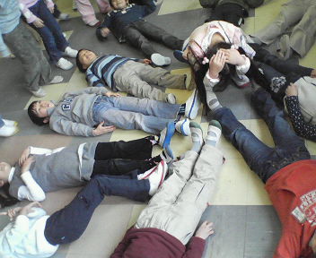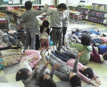 日本語の学習で、体をつかって物を表現しました。まずは二人組で花になり、次はグループで花になり、最後はクラス全員で大きな花になりました。花になりきって、とても楽しく活動しました。