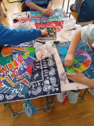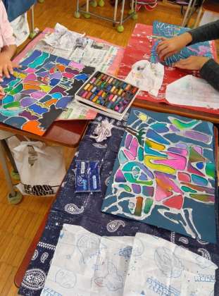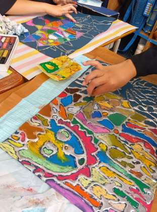 ステンドグラスをイメージしているようです。ボンドのラインを銀色で塗った後は、パステルで空間ごとに色を替えてを塗っていきます。しっかり塗り込んで、指やティッシュを使ってこするように色を混ぜているところもあります。