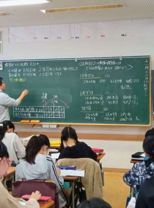 2倍になると2倍、3倍になると3倍・・・少数では?分数では?一方の量が変わるとき、もう一方の量がどのように変わるのか、比例する2つの数量の関係を確かめていました。