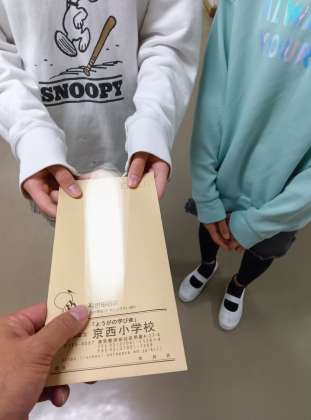 今ちょうど6年生が卒業文集のメッセージ依頼に回っていて、タイミングよく室内で過ごすことになったので私も受け取りました。(写真はテイク2です・・・ありがとうございます。)
