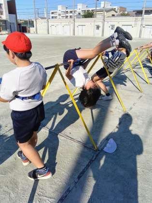 鉄棒は、補助器具を使って逆上がりに挑戦していました。学年が上がるごとにできるようになることとできなくなることがあります。力が付いたり、体のコントロールの仕方を把握してきている反面、体が大きくなった分身軽さが失われてきているからです。