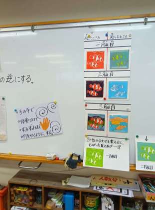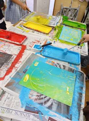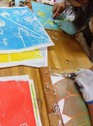 まだ1枚の紙に多色で刷っている子はいなかったですが、まずは、いろいろな色で刷ってみるのでしょうか。洗うと板をリセットできるのでおもしろいです。ここから更に掘り進めて刷り、掘り進めては刷る・・・