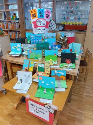 図書室に飾ってある4年生の図工作品「本から飛び出した物語」は何度か作品を入れ替えて展示していただいているようです。ラインナップは変わっても、ずらりとならぶと壮観です。