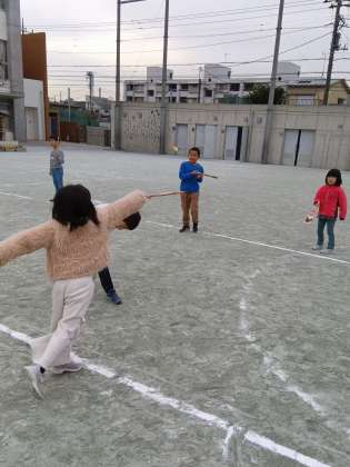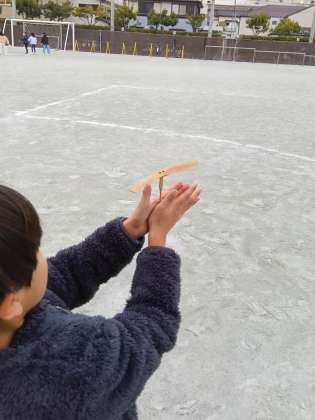 竹とんぼは経験がある子もいましたが、やったことがない子が多かったです。手をこすり合わせる動作が難しいです。速すぎず、遅すぎず、軸を回転させる力がしっかりと翼(プロペラ)に伝わらせなければなりません。しだいにブウンと遠くまで飛ばせる子も出てきました。