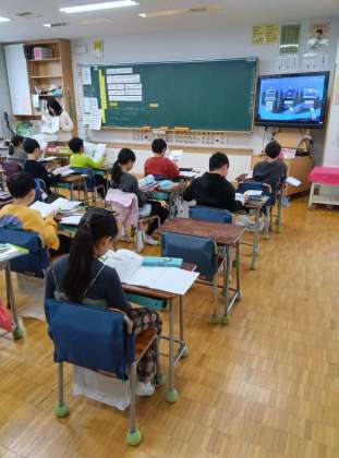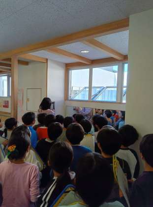 左は、排煙窓を見学する様子です。非常時には、ボタン1つで瞬時に開きます。ただ・・・閉じるのは手動・・・レバーをくるくるくるくる回してワイヤーで引っ張って閉めます。結構大変なので、悪戯厳禁!非常時と3年生が消防の学習をするとき時のみの使用です!実はこの写真、結構前に撮ったんですが、これ1枚きりで関連の写真がなく、眠っていましたが、新聞づくりの場面に出会えたので、復活掲載です。